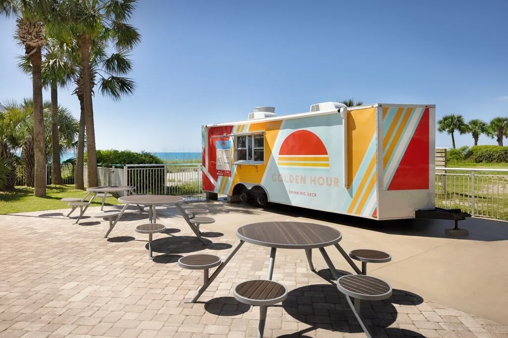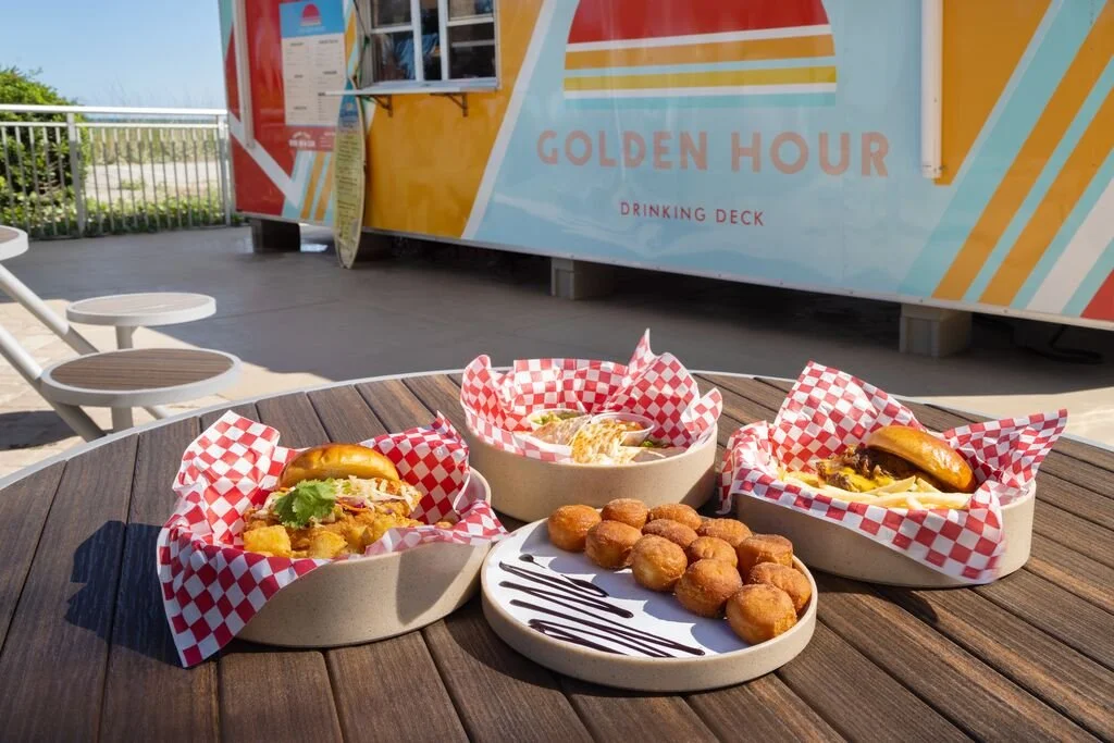 Find the Golden Hour Container Bar on the pool deck. Featuring burgers, tacos, snacks, and frozen drinks, with an unforgettable ocean view.